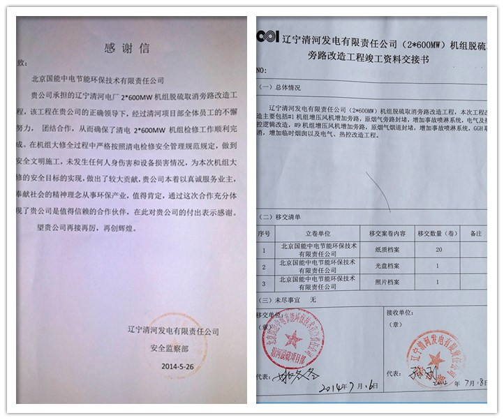 在公司總部的正確領導下,經過清河EPC旁路改造項目部全體成員的共同努力,7月18日,遼寧清河發(fā)電有限責任公司業(yè)主代表在竣工資料交接證書上簽字,標志著我公司承擔的遼寧清河電廠2*600MW機組脫硫取消旁路改造工程正式竣工驗收,成功打響了我司在中國電力投資集團的第一槍。